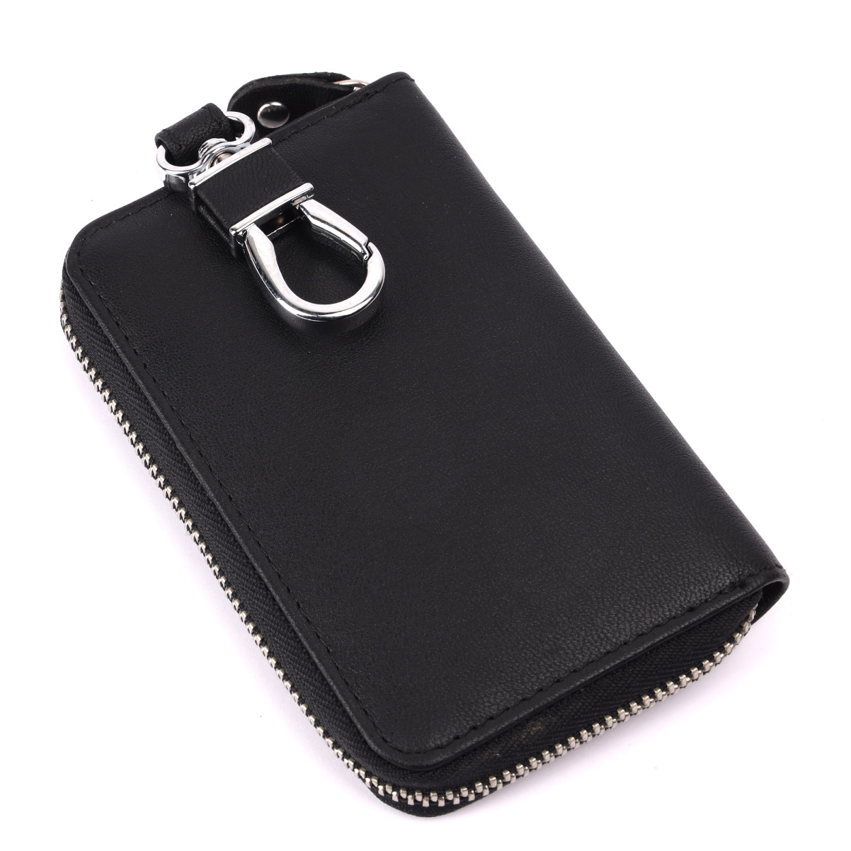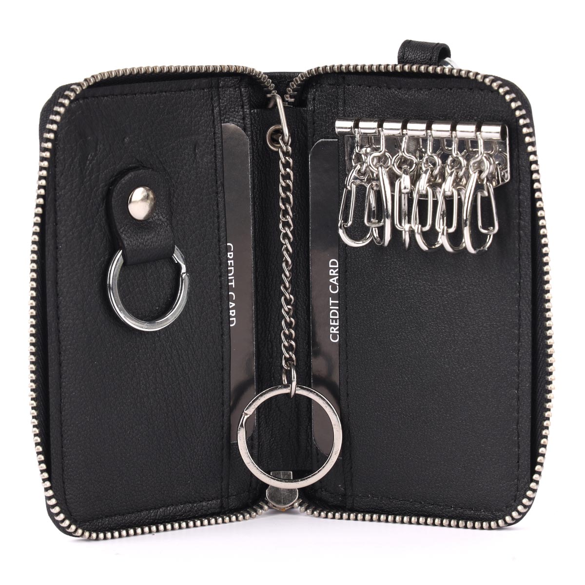 Black Leather Zip Closer Keychain With 6 Keyholders ,two Card Slots And One Dog Hook- MAWESHI