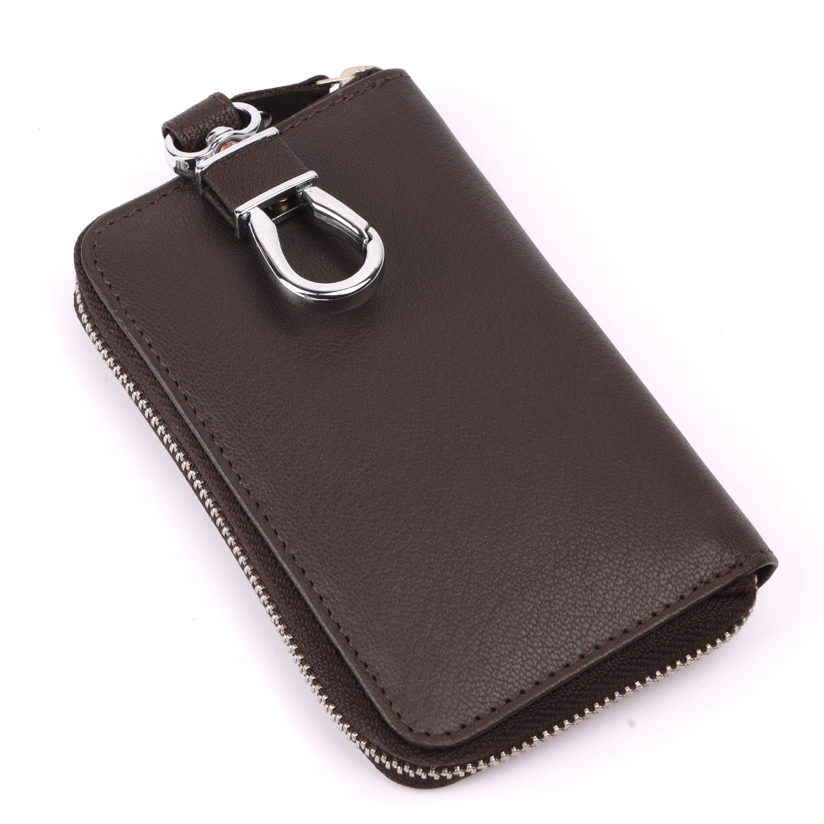Brown Leather Zip Closer Keychain With 6 Keyholders ,two Card Slots And One Dog Hook- MAWESHI