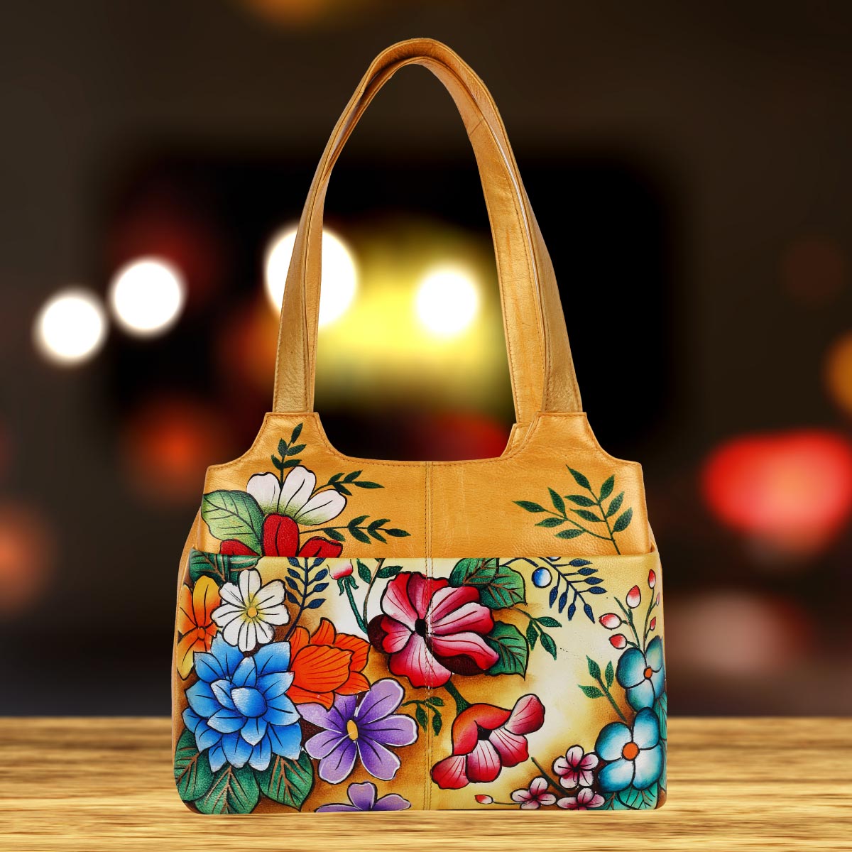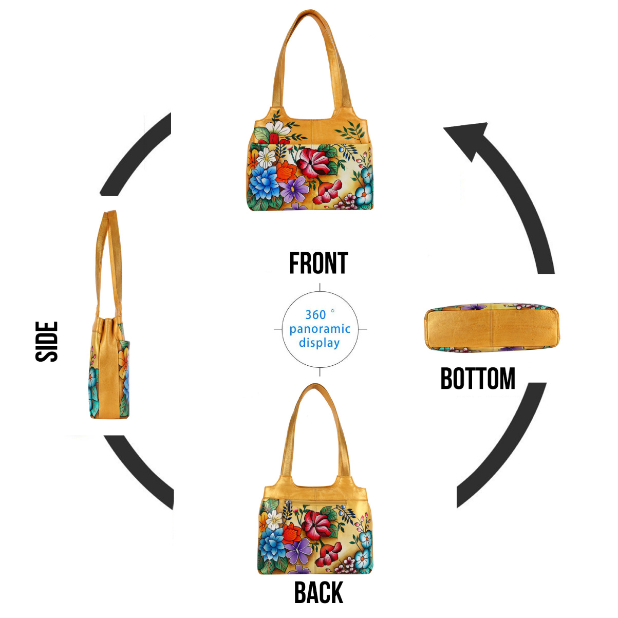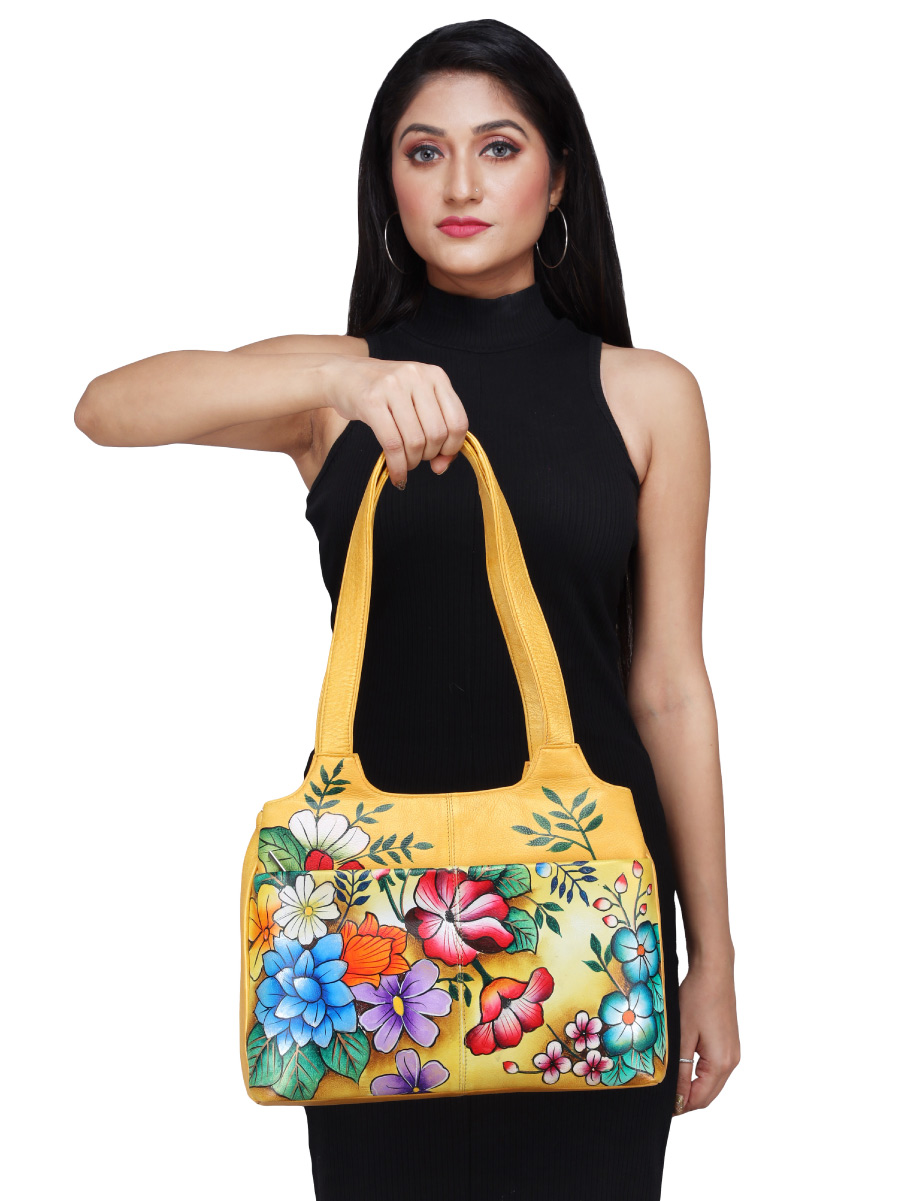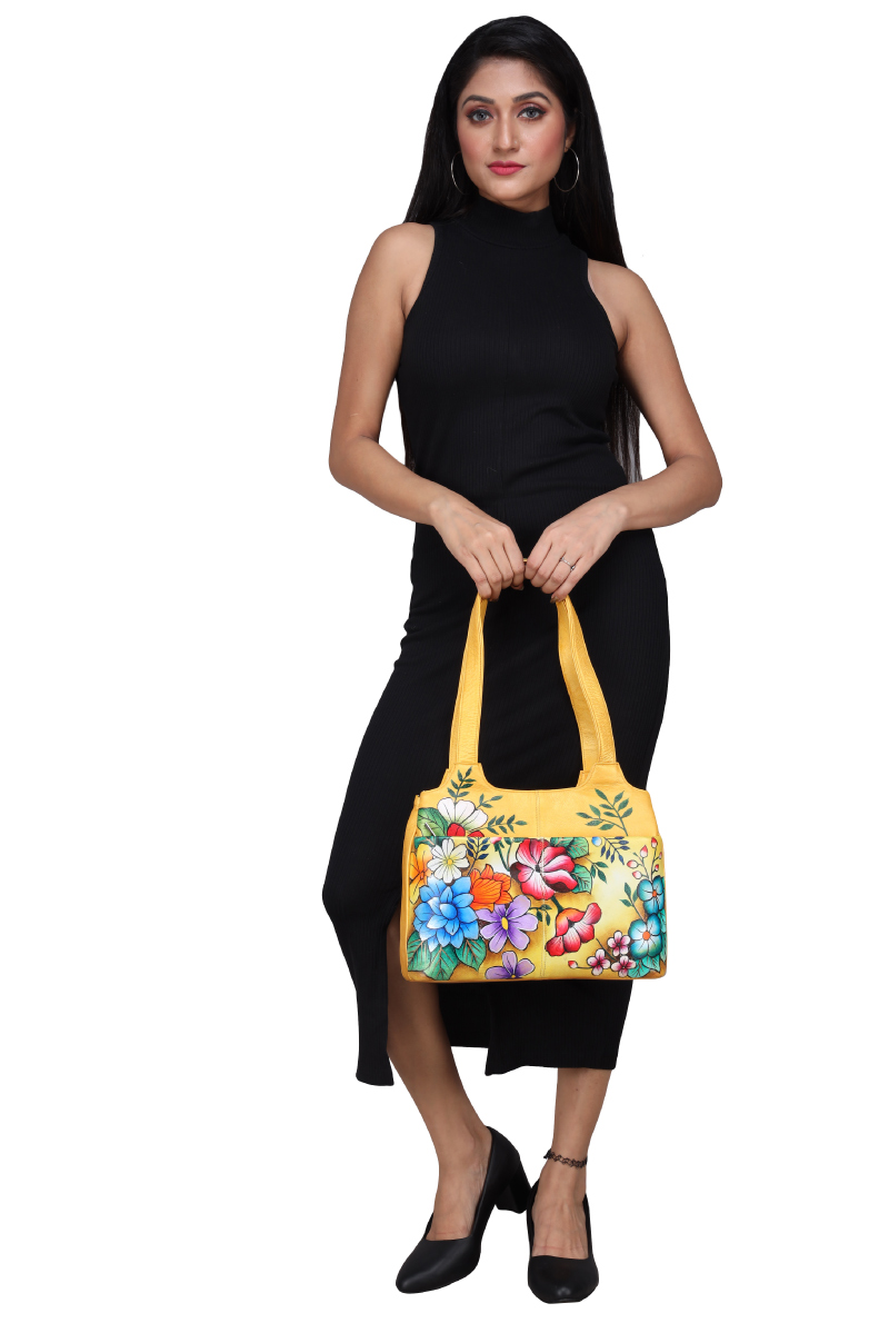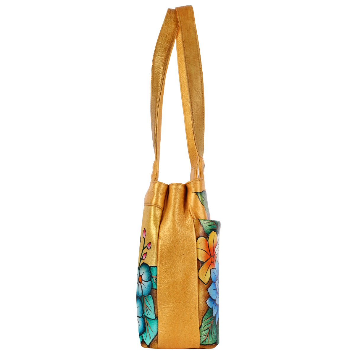 GOLD FLORAL Hand Painted Leather Shoulder Bag For Woman With Triple Compartment