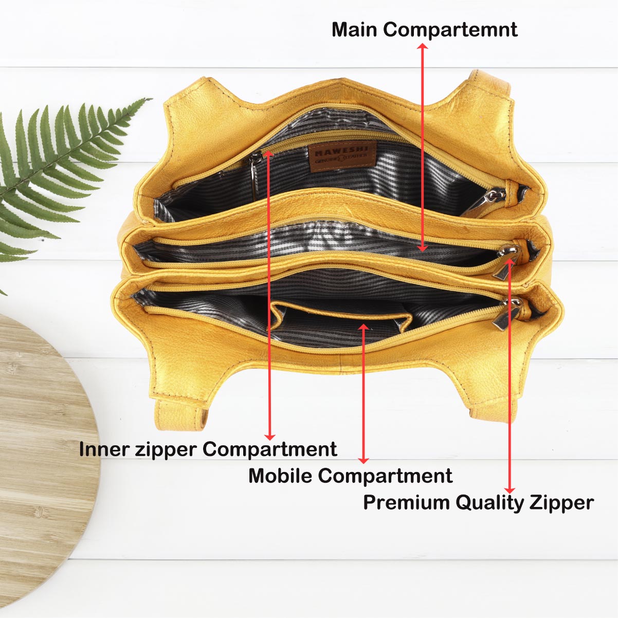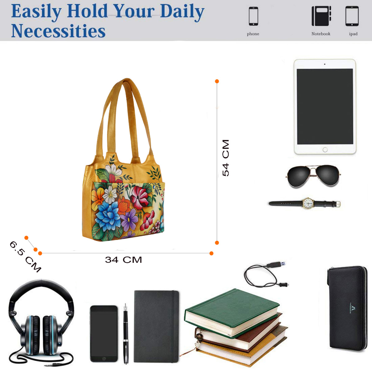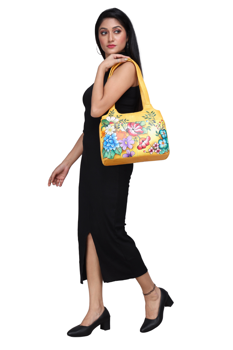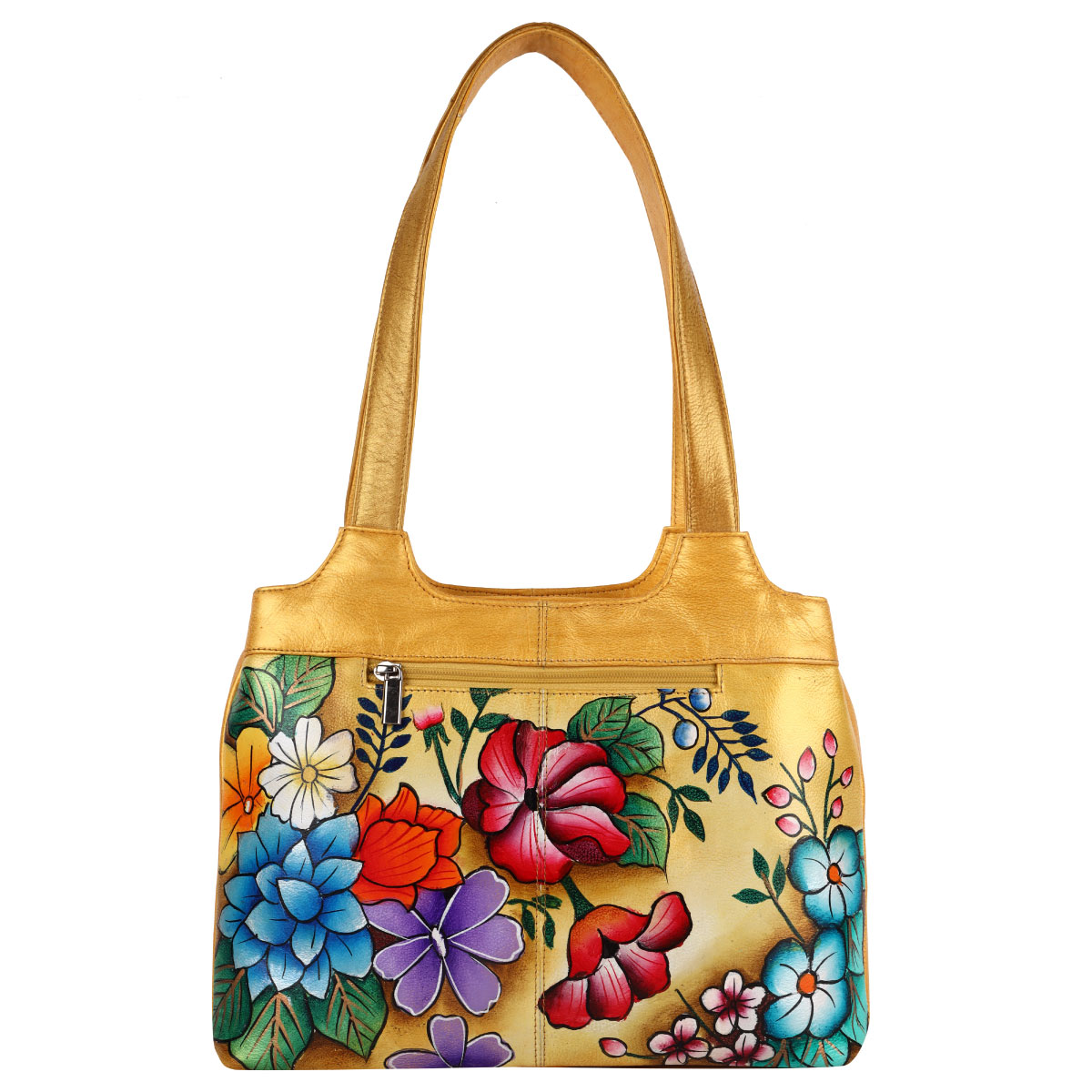 GOLD FLORAL Hand Painted Leather Shoulder Bag For Woman With Triple Compartment