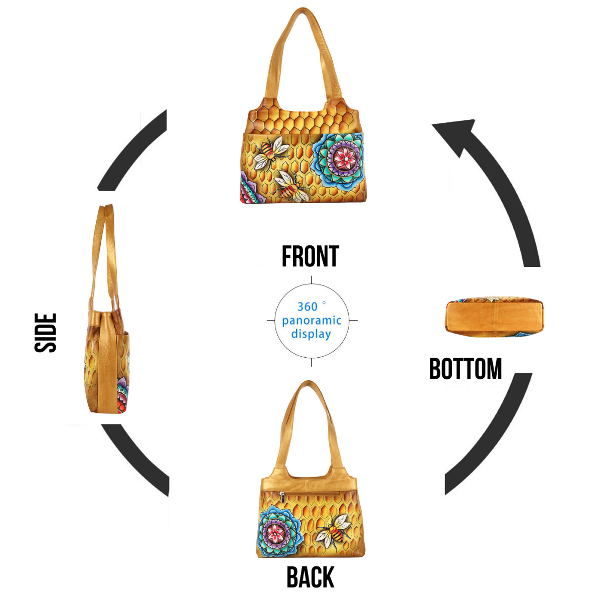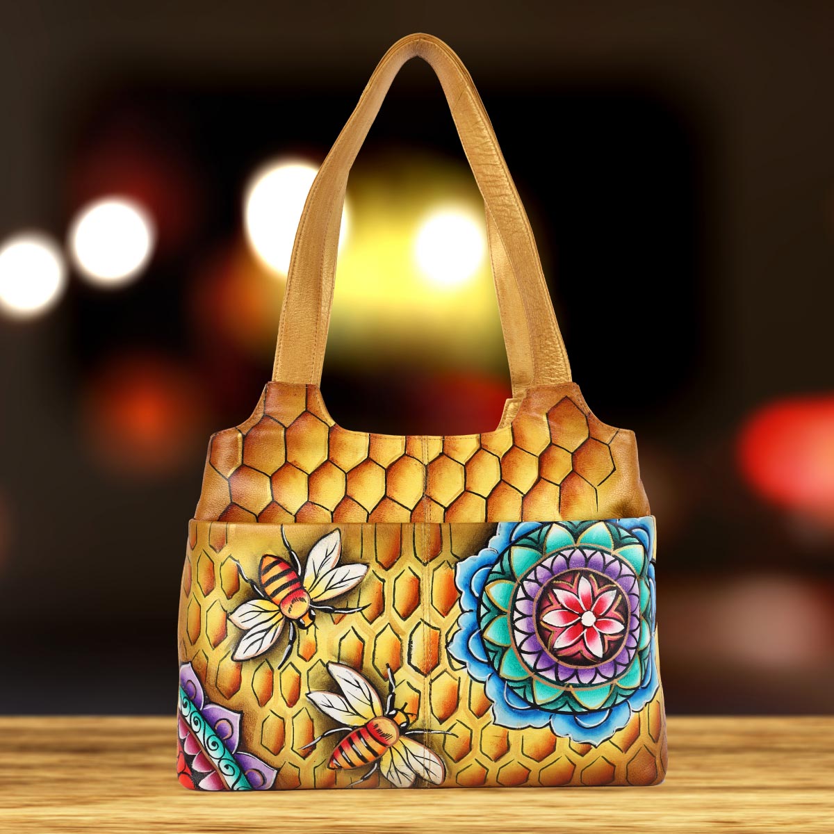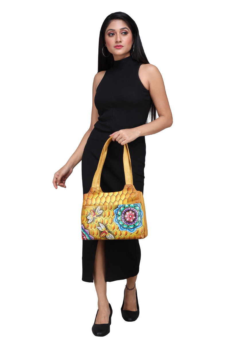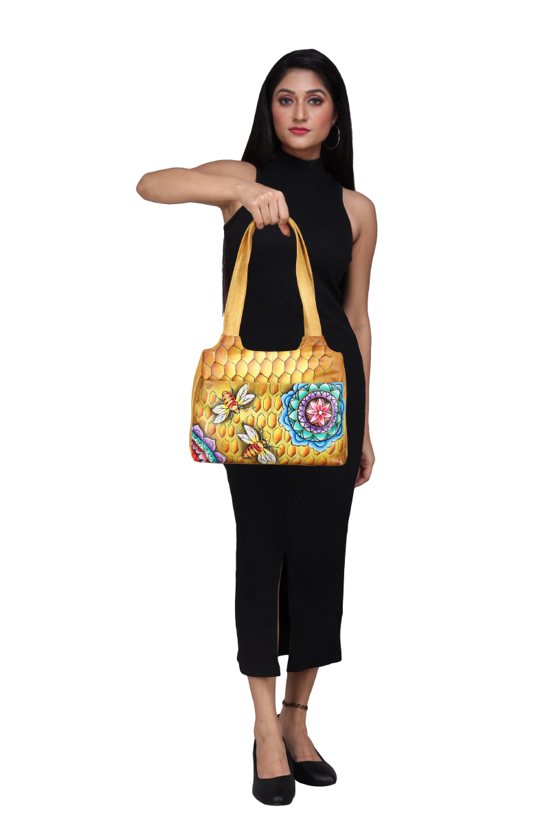 HONEY BEE Hand Painted Leather Shoulder Bag For Woman With Triple Compartment